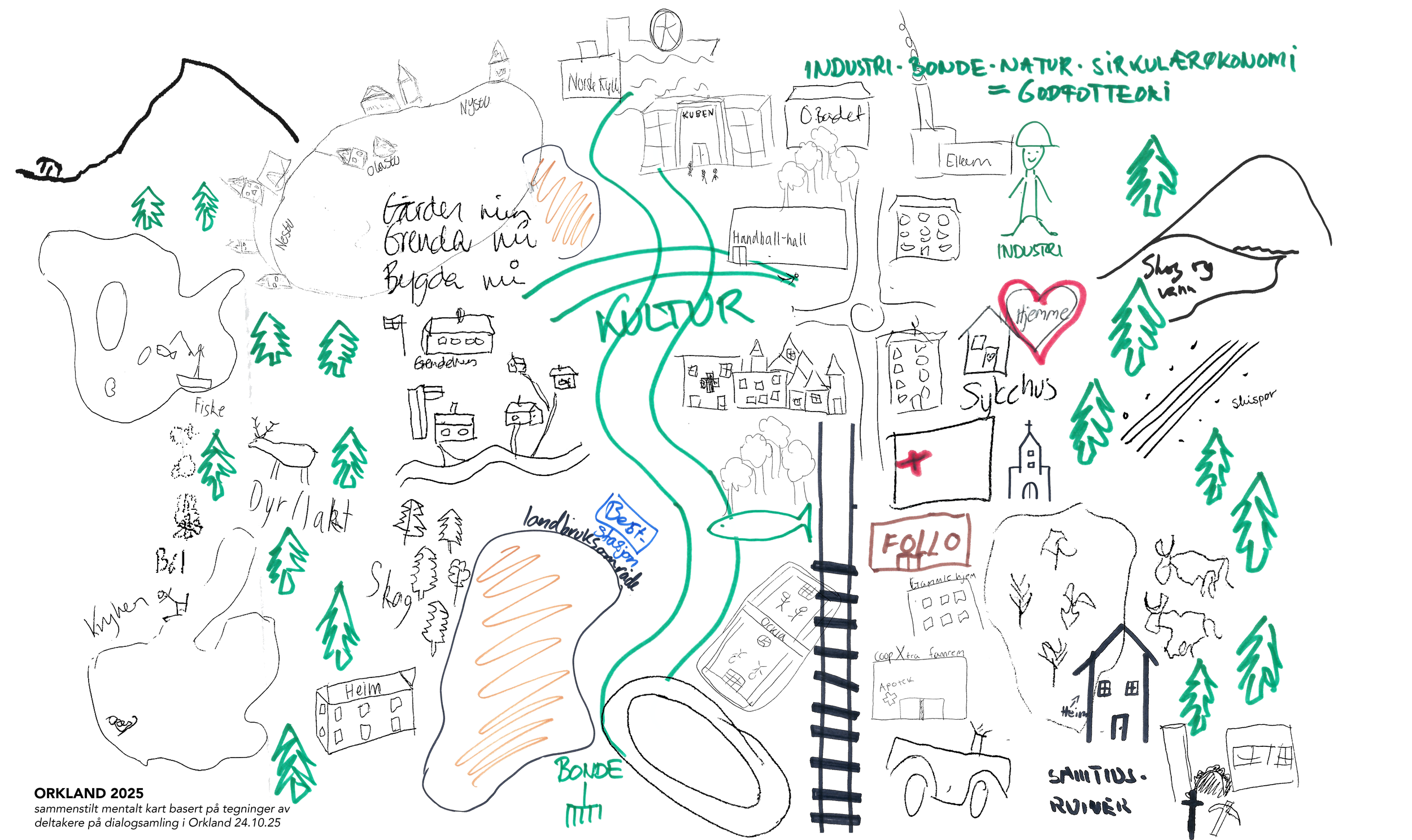 Brukt mental mapping som del av verksted for å la innbyggerne tegne sin nåtid og sine drømmer for Orkland i 2050.